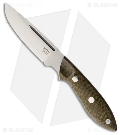 The Bark River Adverturer III is a full sized fixed blade knife ready for any camp or hunting chore. Crucible CPM-154 stainless steel is the perfect combination of tough, corrosion resistant and edge retention for a outdoor fixed blade knife. Green canvas micarta scales are palm filling for a secure and comfortable grip. Weighing 6 ounces, the knife is lightweight in hand or in the included hand made leather belt sheath.