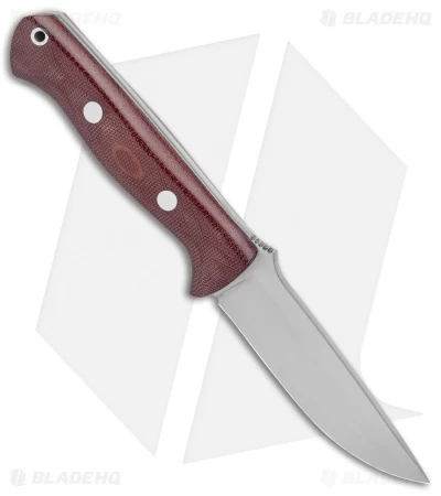 - Burgundy canvas micarta handle scales bolted and epoxied to the skeletonized full tang.