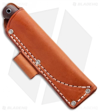 This model of the Bark River Pro Scalpel II comes with a burgundy micarta handle, a satin finished blade, and a brown leather sheath.