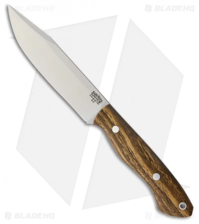 The 5″ blade made of durable A2 tool steel features a high ground convex edge makes quick work of hide and meat, while capable of wood carving and fire prep. Ergonomic Bocote wood scales accommodate a variety of grips for controlled and comfortable use. Excellently well balanced, the sub 8 ounce weight is barely noticeable in hand or on your belt with the included hand made leather belt sheath.