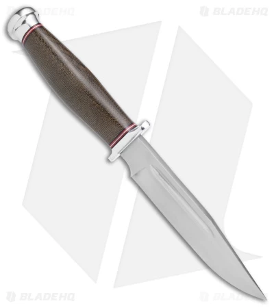 - Green canvas micarta handle with a stainless steel guard and an aluminum pommel.