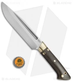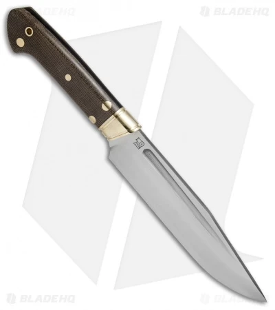 The Bark River Vidarr is custom knifemaker Dan Tope’s take on a fusion of the American Bowie and Scandi Bowie knife. It features a durable Bowie-inspired blade with a convex grind and a large fuller groove. The handle is a comfortable combination of brass and polished Micarta that offers a practical grip and an eye-catching aesthetic. Includes a genuine leather belt sheath for secure carry.