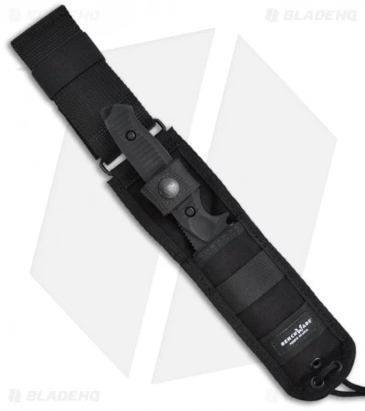 The 140SBK Nimravus is a well-built, high quality fixed blade knife. The 154-CM stainless steel drop point blade has a tactical black BK1 finish and a partially serrated edge. The full tang handle is ergonomically shaped and features a deep index finger groove and a notched thumb ramp above for superior hand grip. The scales are anodized 6061 T-6 aluminum for lightweight performance. The Benchmade Nimravus line of knives come with a tough MOLLE compatible nylon sheath. The Benchmade Nimravus Kydex sheath is also available separately.