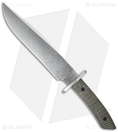 Pictures may not fully capture the epic size of the El Gigante fixed blade, but in hand and on task this knife demands respect. It’s a beast of a knife with a stunning polished, stonewash finished Böhler N695 steel blade that’s full-tang and tapered at the pommel. The handle is outfitted with a brushed stainless steel hand guard and fluted canvas Micarta scales. Includes a premium leather sheath with decorative design.