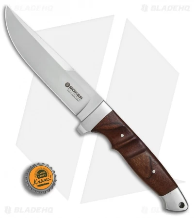 Boker’s Vollintegral 2.0 improves upon the original design with optimized ergonomics and increased strength. The walnut wood handle features rounded edges and finger grooves for comfortable handling and aesthetic appeal. Its satin finished 440C stainless steel blade has a flat grind to improve overall cutting performance. Includes a genuine leather belt sheath.