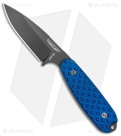This Blade HQ Exclusive Bradford Guardian3 features a black DLC blade made of CPM-M4 steel and some textured black and blue G-10 handle scales.