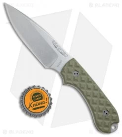 This knife has a stonewash blade with a false edge (swedge) and OD green G-10 scales.
