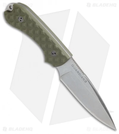 The Guardian3 is a relatively compact fixed blade that is designed to handle the work load that might typically fall upon a heavy duty everyday folder. Bradford Knives uses Bohler M390 steel with a double temper and cryo treatment for exceptional blade characteristics. Machined G-10 scales offer extreme grip without being abrasive. Each knife includes a premium leather sheath with belt loop and plastic blade insert.