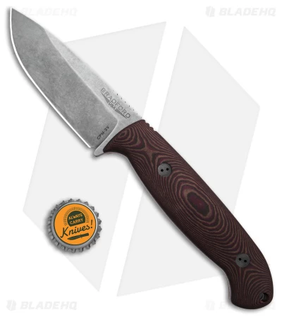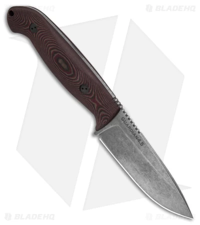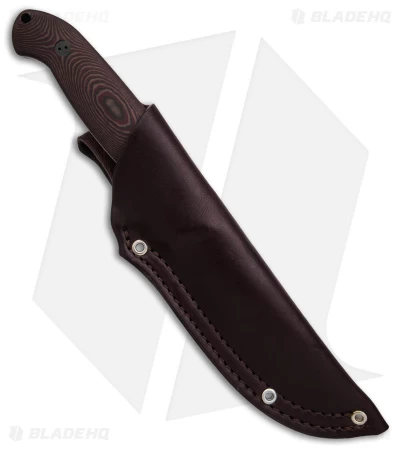 - 3D textured red and chocolate Richlite handle scales over a full tang.