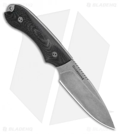 This Guardian4 model features a Peters’ heat treated CPM-3V steel blade with a sabre grind and a stonewashed finish. The handle is fitted with black 3D Micarta scales.