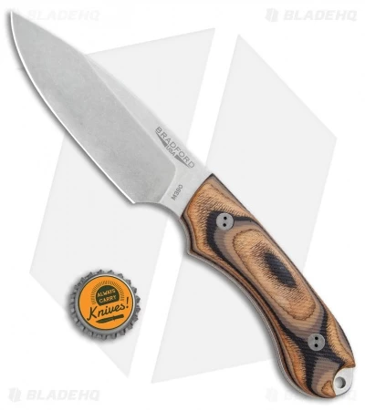 This knife has a Bohler M390 steel blade with a sabre grind and stonewash finish. G-Wood scales.