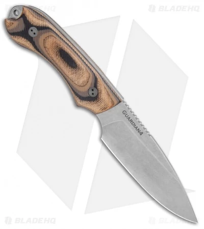 The Guardian4 joins the Bradford Knives lineup, offering a larger blade that is well-suited for camping and hiking activities. It shares the same design as the Guardian3 and is available in a false edge (swedge) or sabre grind, with several blade finish options. The choil is designed to easily strike a ferro rod and the handle has G-Wood scales (spanner #6 is required to remove scales). Each knife includes a premium leather sheath with a protective plastic blade insert and is set up for vertical carry.