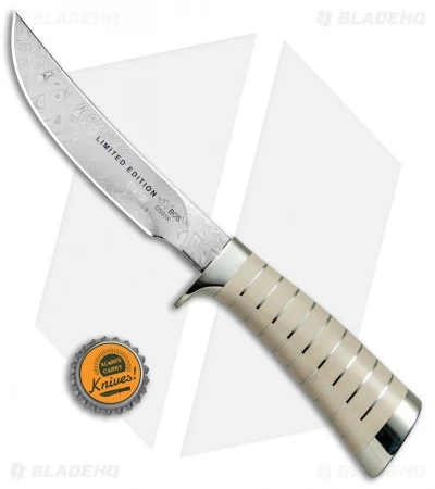 This Buck Expert Hunter Legacy model is built with a rich stacked ivory handle and a nickel silver guard. The blade comes in a trailing point style made from polished Damasteel. It is limited to just 100 pieces worldwide and includes an impressive walnut presentation box.