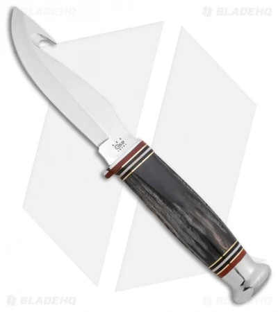 The Case Guthook Hunter with buffalo horn scale is the tool you need for your next hunt. A 4.375″ hollow ground blade is perfect for skinning and cleaning your trophy. Comfortable and secured jigged buffalo horn handles with brass, aluminum and fiber accents. Aluminum mushroom pommel and finger guard provide additional safety while in use. Easily carried in the included black leather belt sheath.