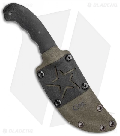 - Fitted OD Green kydex sheath with a star overlay and belt clip.