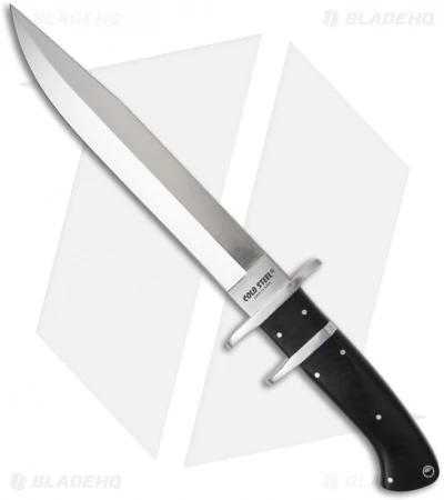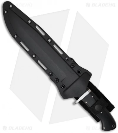 This knife uses a VG-1 San Mai III® blade that is found in Cold Steel’s famous Tanto series. This 8″ blade offers excellent reach and incredible penetration with very little physical effort. The sub hilt practically eliminates the possibility of the hand being dislodged or coming into contact with the blade. The blades are perfectly heat treated and a double grind is expertly applied. Then the surface of the blade is polished to a beautiful satin finish, and the edges are honed and buffed to hair shaving sharpness! The black linen Micarta scales are fastened to the blade tang by 6 stainless pins and expertly hand shaped and contoured. Then the handle, including the 300 series stainless guard and sub hilt is buffed to a lustrous shine that will rival the finest custom knives! The Black Bear comes complete with a Secure-Ex® sheath.