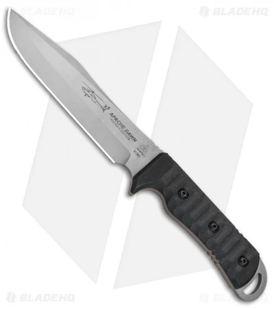 The Apache Dawn from TOPS Knives is a capable all around combat/field knife with the weight, length, and durability your toughest tasks demand. Its full-tang 1095 carbon steel blade offers top-notch performance in a tumbled finish. This Rockies Edition model features a black G-10 handle with grip enhancing Rocky Mountain Tread and a pronounced finger guard. Includes an olive drab MIL-SPEC nylon sheath.