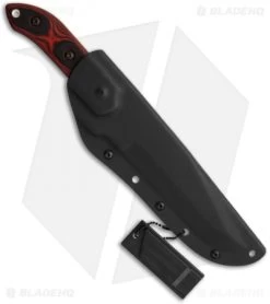 The Black Heat knife is a striking design with plenty of substance. It features a full tang drop point blade with a tactical black traction coating. The handle has red and black G-10 scales and a lanyard hole. Includes a black Kydex sheath with pivoting clip.