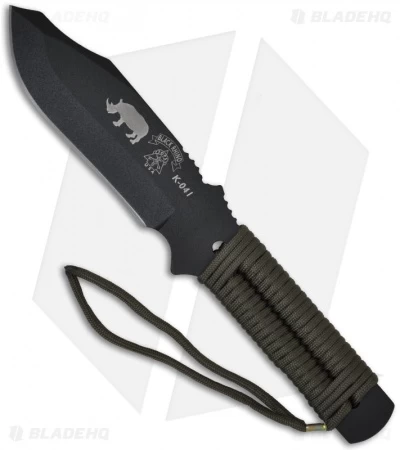 This Black Rhino features OD green 550 paracord wrapped handles with a pry-splitter at the base. The black traction coated blade is made from 1095 steel and has a plain edge. Included is a heavy duty ballistic nylon sheath. Made in the USA.