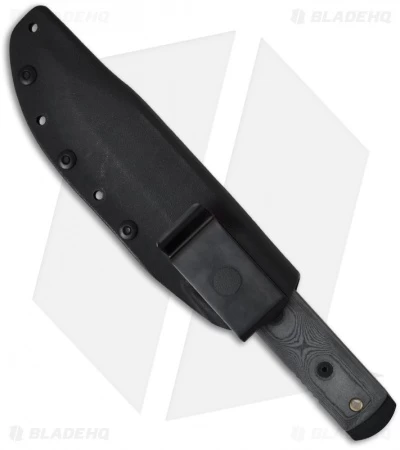 Features black linen Micarta handles with pry-splitter, black traction coated plain blade and heavy duty kydex sheath.