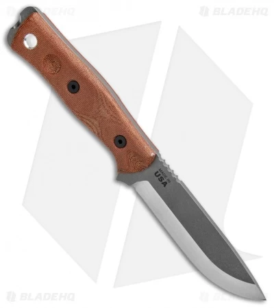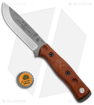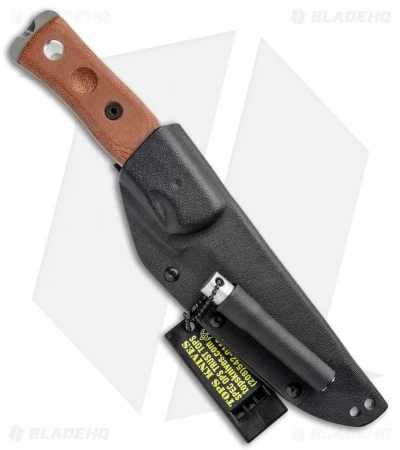 This model of the TOPS Knives BOB Fieldcraft fixed blade sports coyote tan micarta scales and a gray finished 154CM blade. It includes a Kydex sheath and a firestarter set.