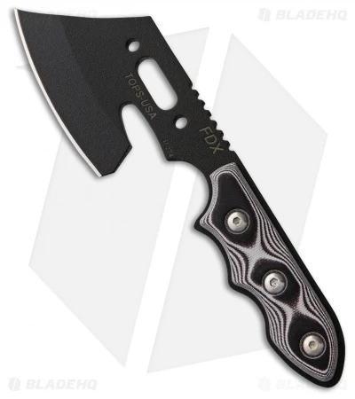 The TOP Knives FDX-18 Mini Axe with black and white handle scales features a black traction coated 1095 carbon steel blade.