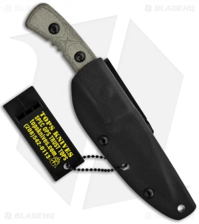 TOPS’ Little Bro is smaller in size, but just as tough as its bigger brothers. It has a 1095 high carbon steel blade with swedge ground spine and black linen Micarta handle. The Little Bro has a grown up Kydex sheath with rotating steel spring clip.