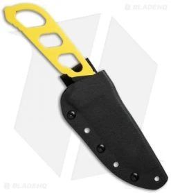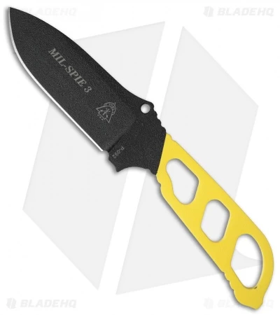 This is the TOPS Knives MIL SPIE 3 Code Yellow. It is the smaller of the TOPS Knives MIL SPIE line (Military-Special Projects Individual Equipment). The MIL-SPIE 3 is more adept at belt or vest carry, while still maintaining a low profile. The skeletonized handle is yellow coated while the blade has a black traction coating.