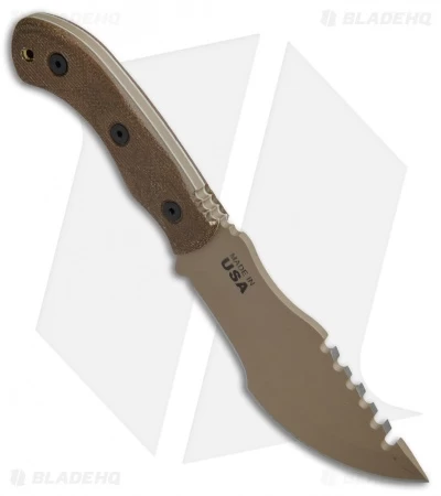 The Mini Tom Brown Tracker knife is designed by Tom Brown as a scaled down survival knife that keeps weight to a minimum. This Mini Tom Brown Tracker has a tough 1095 steel blade with a Coyote Tan traction coating and thin Micarta scales that make neck carry more comfortable and discreet. The Kydex sheath features a removable clip for neck carry.