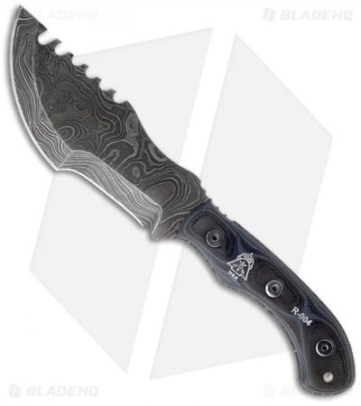 This is a limited edition Mini Tom Brown Tracker #4 with a Damascus steel blade and blue/black layered G-10 handle. Includes black leather belt sheath. Serial numbered on handle and includes certificate of authenticity.