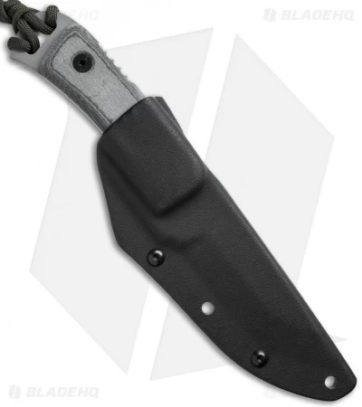 The Overlander is a smaller sized fixed blade that feels is ready for the long road journey or weekend adventures. It has a hunter point high carbon steel blade with a tactical gray finish. The handle is outfitted with black linen Micarta scales, a subtle yet sufficient blade guard and notches on the spine. Includes wide lanyard hole/slot and black Kydex sheath with rotating steel spring clip.