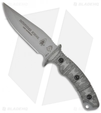 The Pathfinder School knife from TOPS Knives. Tactical gray finished 1095 steel blade with Pathfinder School/Dave Canterbury logo. Rocky Mountain Tread (RMT) canvas micarta scales provide a sure grip and superb traction. Index coil on blade and jimping up top for small cutting tasks.