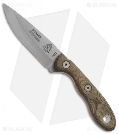 The Scandi Trekker is built for those who want something smaller than the popular Brothers of Bushcraft, but bigger than TOPS Knives’ Mini Scandi 2.5. It boasts a tumbled 1095 steel modified scandi grind blade and green canvas Micarta handle scales for prolonged, every day use. You’ll find that the scandi grind gives you excellent control while still maintaining a very sharp edge on a wide variety of cutting tasks.