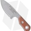 Built in TOPS Knives fashion, the Silent Hero has a 1095 steel blade with a “black river wash” finish, which has a darkened finish along the edge where the blade has been heat treated. The handle is fitted with Rocky Mountain Tread pattern linen Micarta scales for an uncompromising all-weather grip. Two lanyard holes, one in the handle along with another in the finger guard, give the user the option to add a safety cord or for lashing to a spear when the situation warrants it. The black leather sheath is durable and looks great paired with this knife. The Silent Hero is held in place with a single snap loop that curls around the finger guard.
