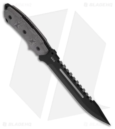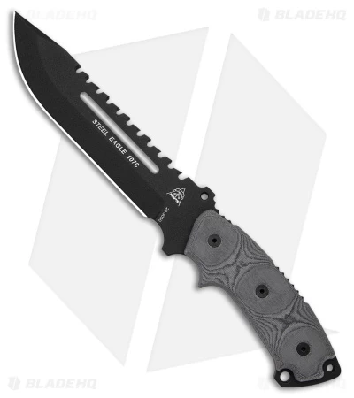 This Steel Eagle knife features a full tang drop point blade with tactical black coating and sawback spine. The handle is made of black linen micarta. Complete with black nylon sheath.