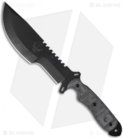 Built by TOPS Knives, the SXB delivers solid performance and a tank-like build. The full-tang 1095 steel blade is black coated and outfitted with Rocky Mountain Tread pattern black canvas Micarta scales for extreme grip. A MOLLE compatible heavy duty nylon sheath is supplied with the Skullcrusher’s Xtreme Blade knife.