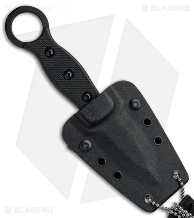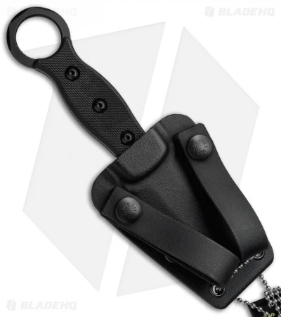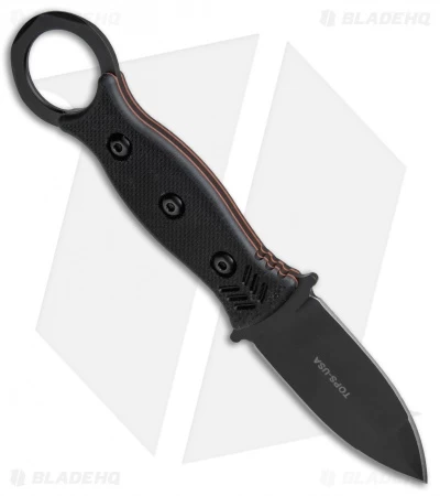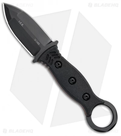This I.C.E. Dagger has a double-edged dagger blade with a black Cerakote coating and a kydex sheath with beta loops attachment. The TOPS I.C.E. (In Case of Emergency) was designed by Andy Tran to serve as a back-up blade for tactical operators and EDC enthusiasts. It is characterized by a stout double-edged dagger blade with a compound grind and a black oxide finish. The handle is equipped with textured G-10 handle scales and a karambit style finger ring. Jimping and a micro guard improve grip and offer safe operation. The I.C.E. dagger includes a one-piece taco style kydex sheath, available with a neck chain or beta loops.